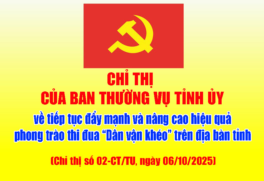 Ngày 06/10/2025, Ban Thường vụ Tỉnh ủy đã ban hành Chỉ thị số 02-CT/TU về tiếp tục đẩy mạnh và nâng cao hiệu quả phong trào thi đua “Dân vận khéo” trên địa bàn tỉnh; Cổng TTĐT Đảng bộ tỉnh xin trân trọng giới thiệu toàn văn Chỉ thị